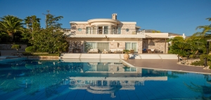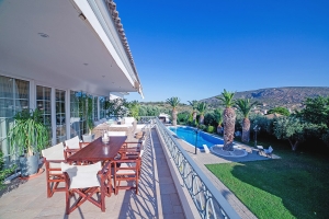The villa offers spectacular views of the sea from its elevated position above Athenian Riviera.