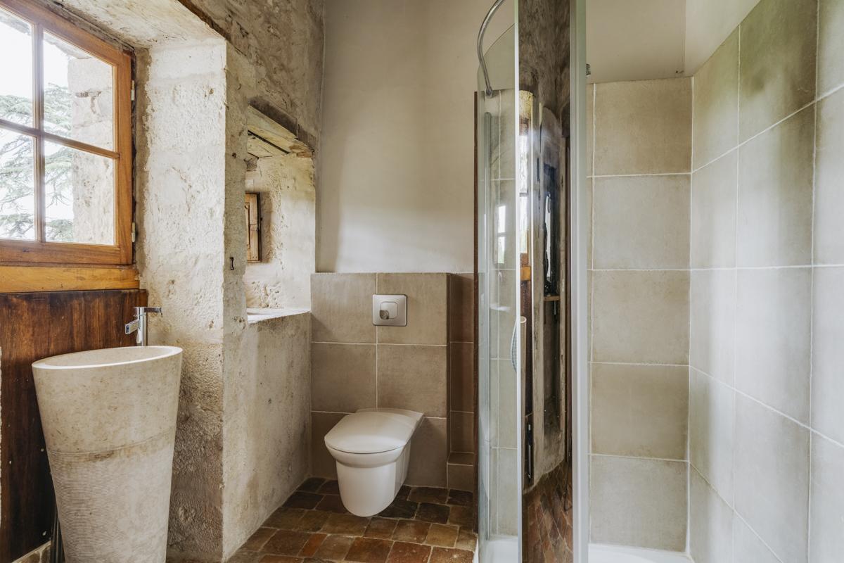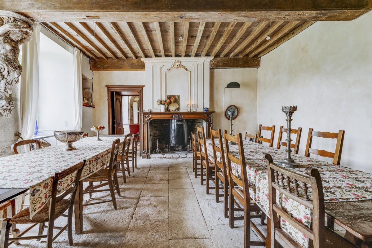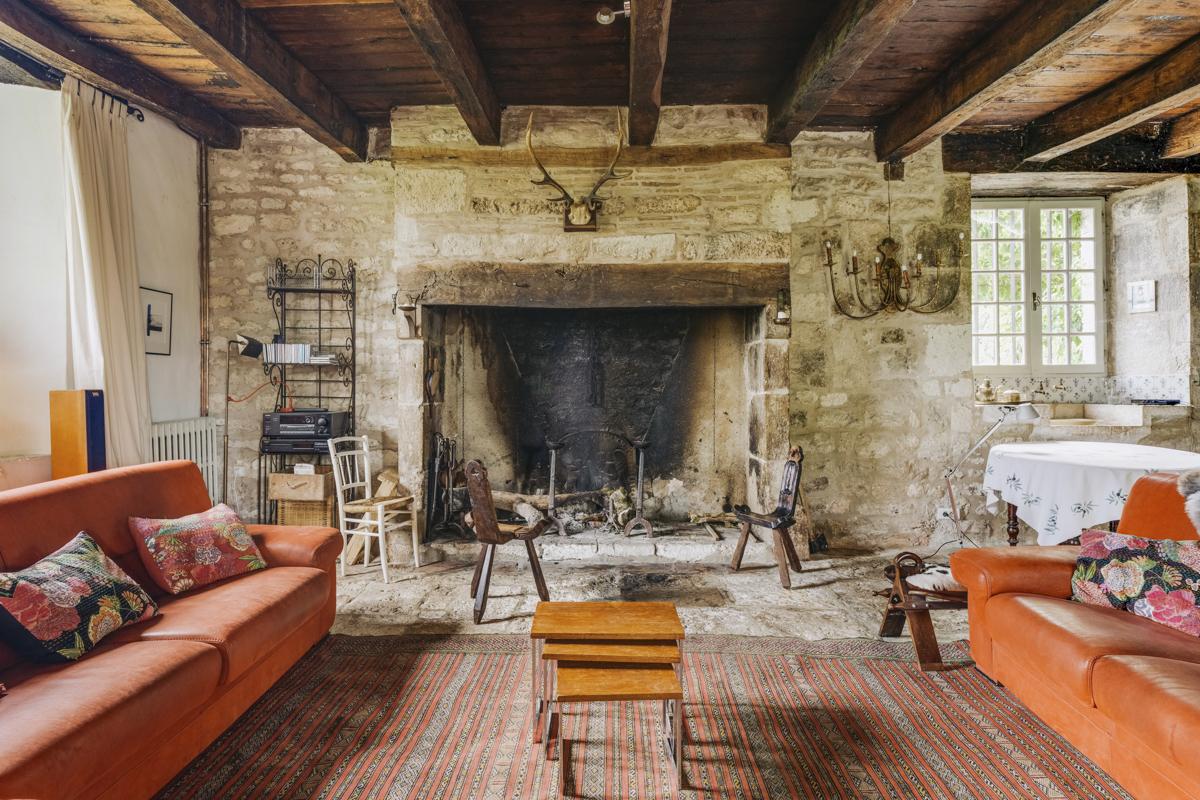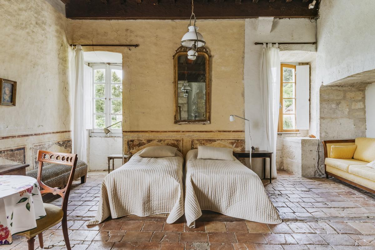 Simple furnishings allow the château's character to shine through; stone walls, well-loved brick fireplaces, and mysterious spiral stairs all hint at a storied past.