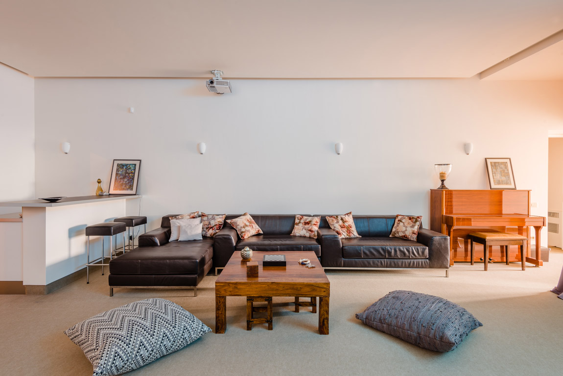 On the ground floor, there are three bedrooms with an en-suite bathroom. In addition, there is a large playroom with a fireplace, a home cinema and an elevator leading to the first floor.