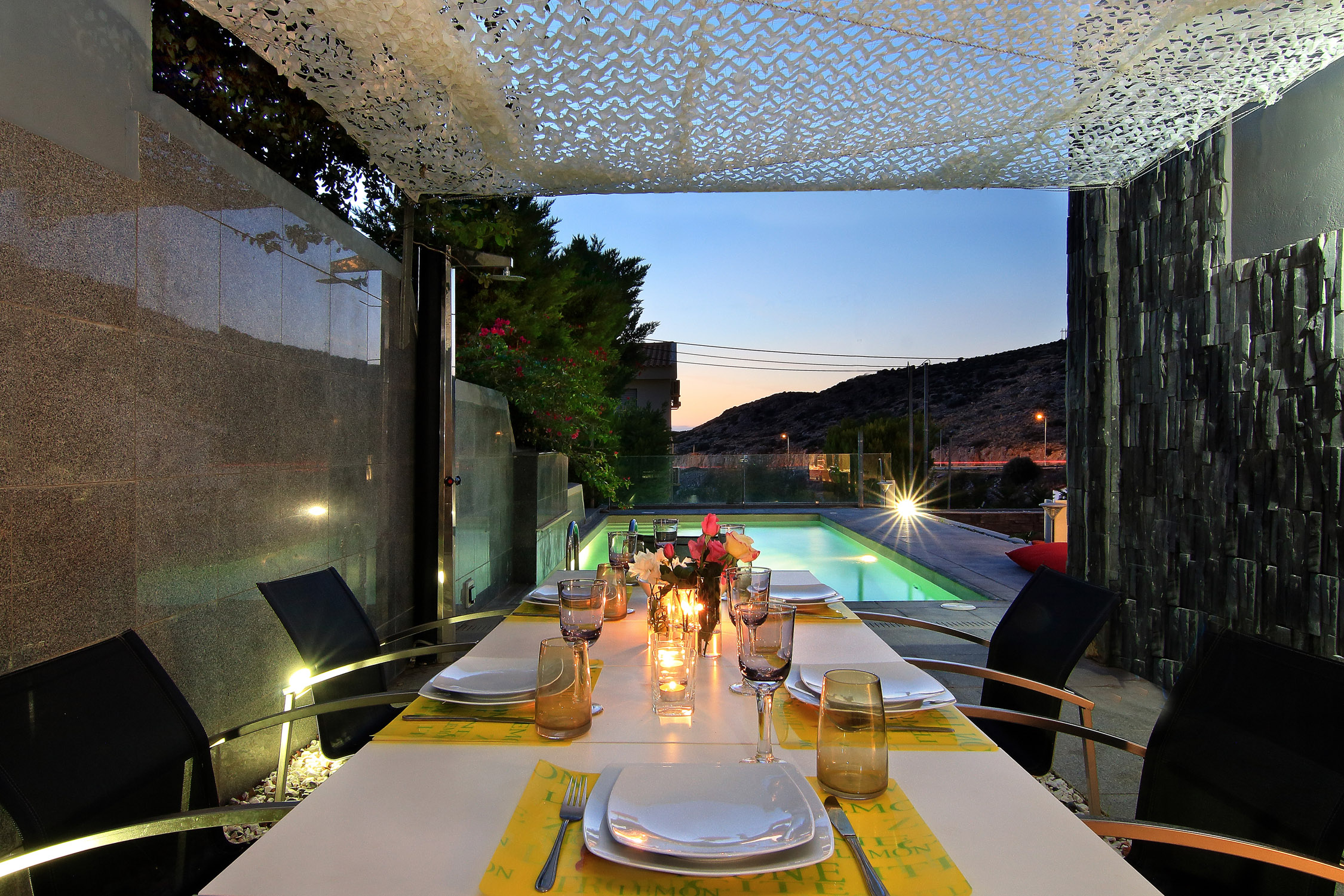 The contemporary furniture, the black chaise-longue and the lighting radiate a refined modern atmosphere. In addition, large windows which lead directly to the swimming pool create an airy feeling in the living room. At the same time, the adjacent dining area and a fully equipped kitchen are ideal for guests who enjoy gatherings and preparing dinner together.