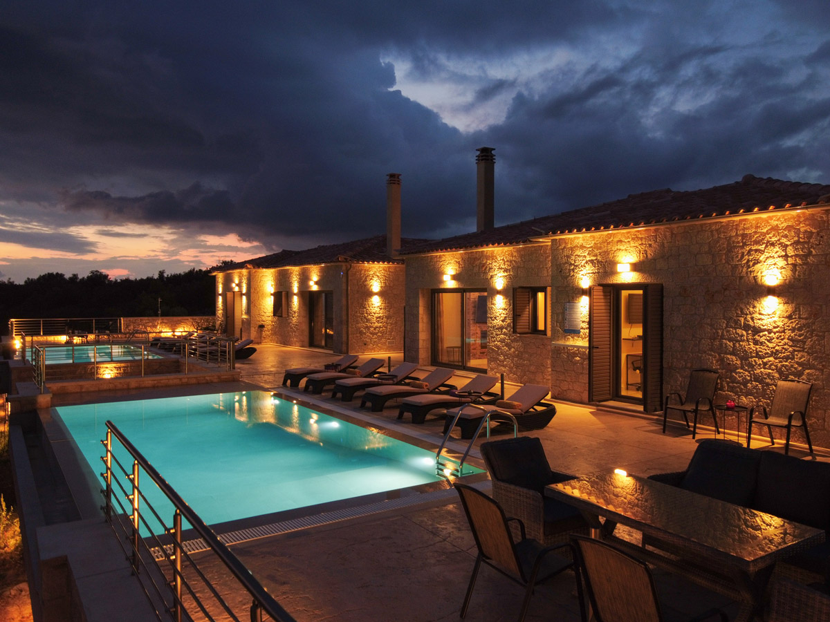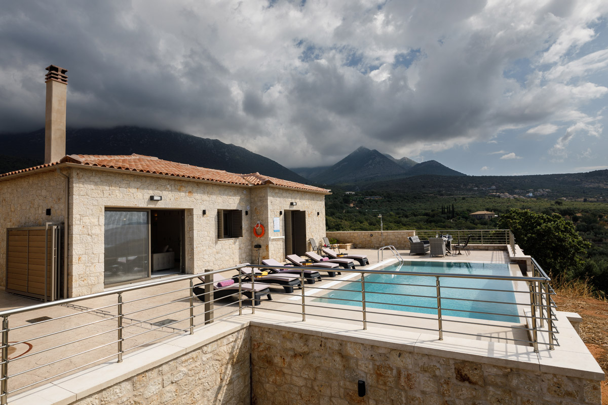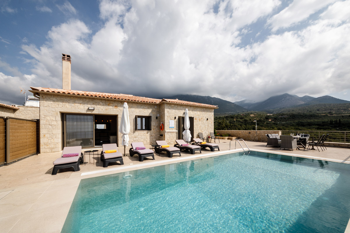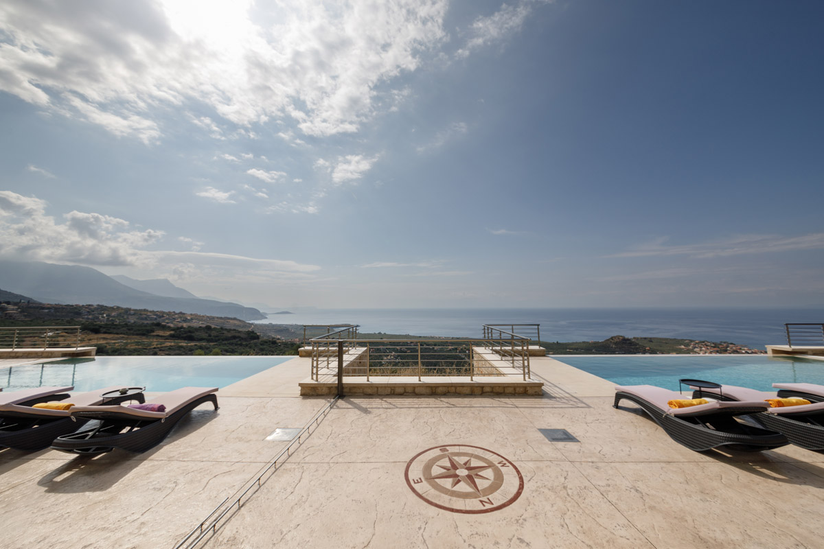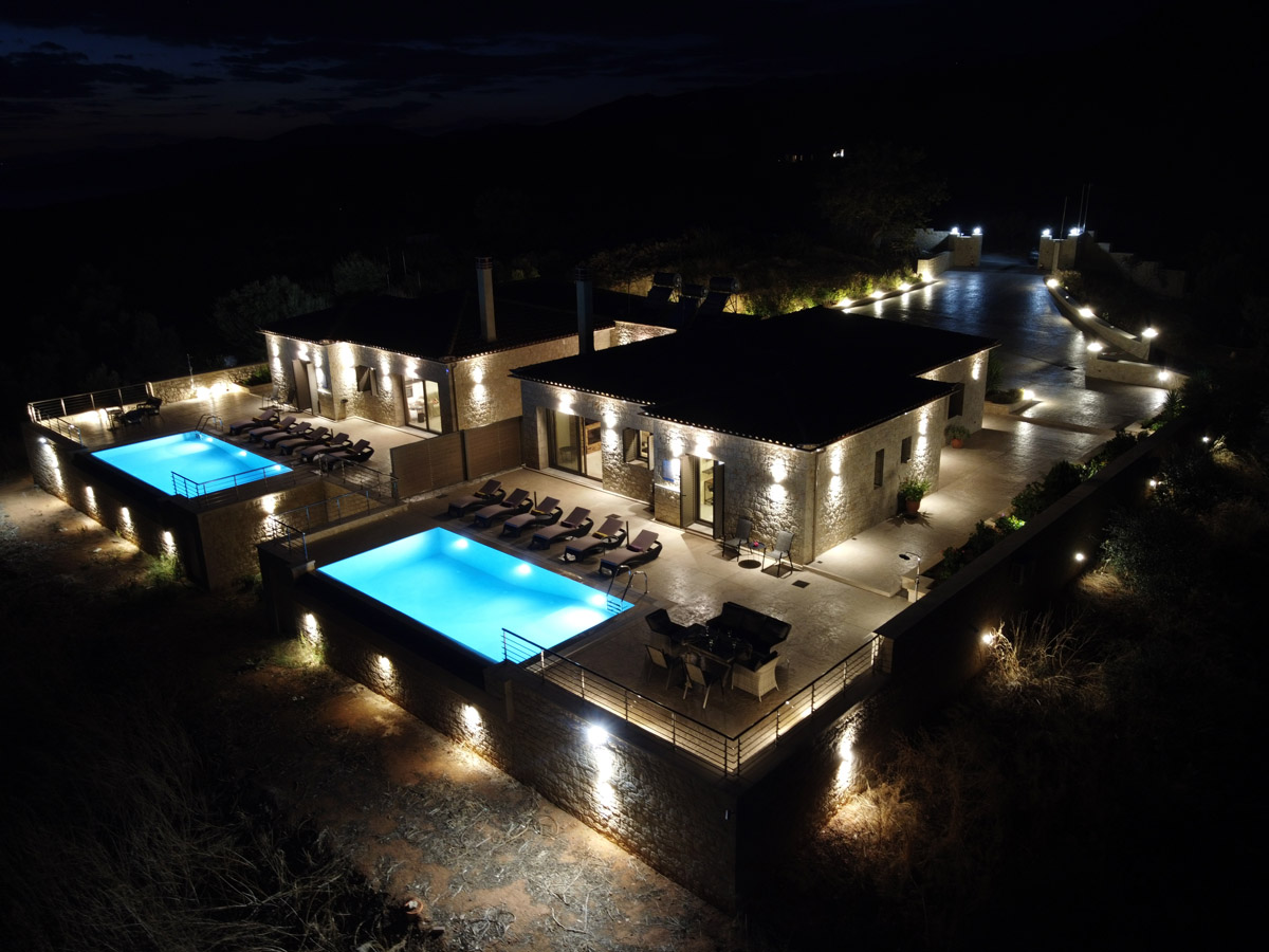 Cosmic Villas is pleased to present this estate, which includes two new (2021) luxury 3-bedroom villas with panoramic sea and mountain views and two private pools. It can sleep 12 adults and 2 children.
