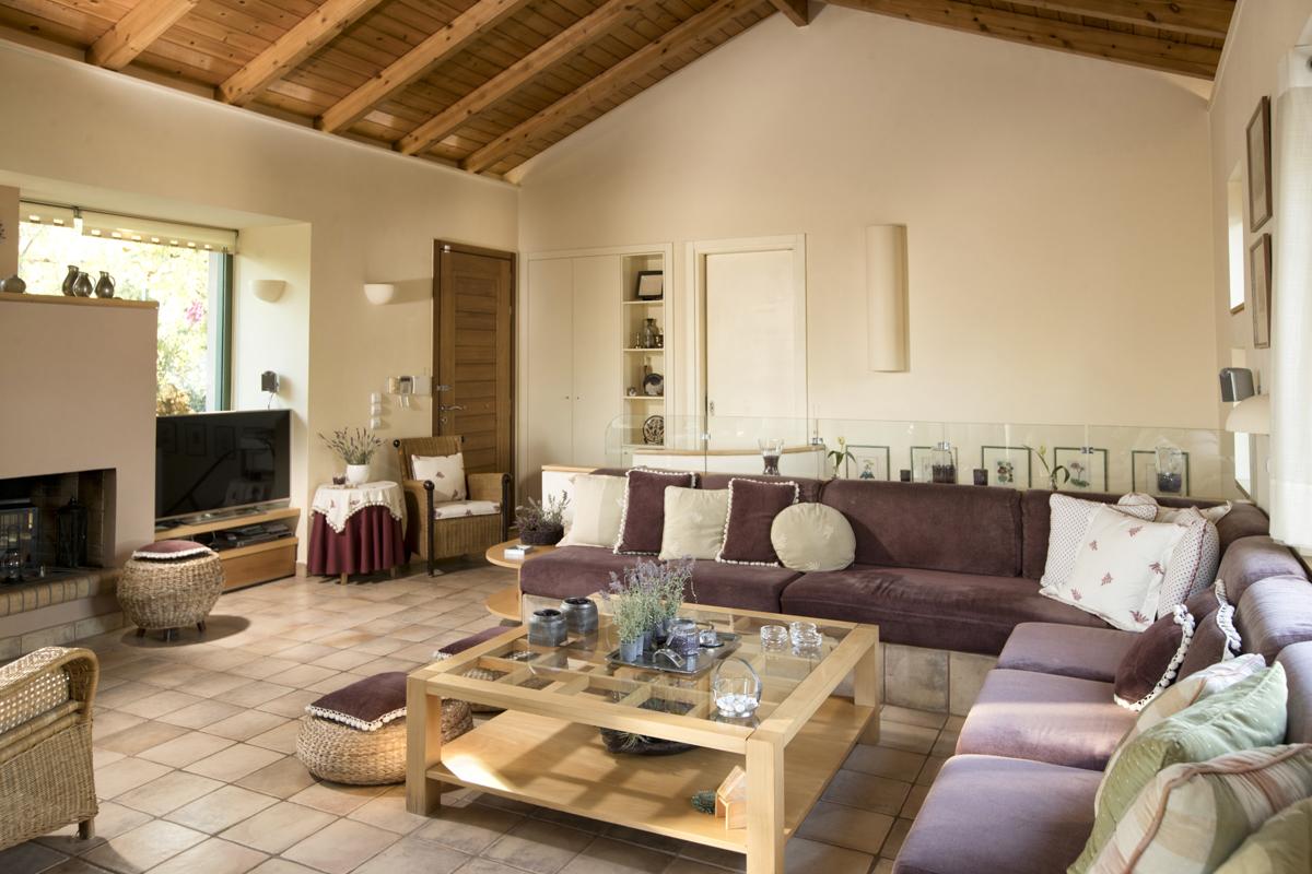 The living area boasts an alluring beamed ceiling and a huge corner sofa. The views of the pool and terrace from the dining area are lovely.