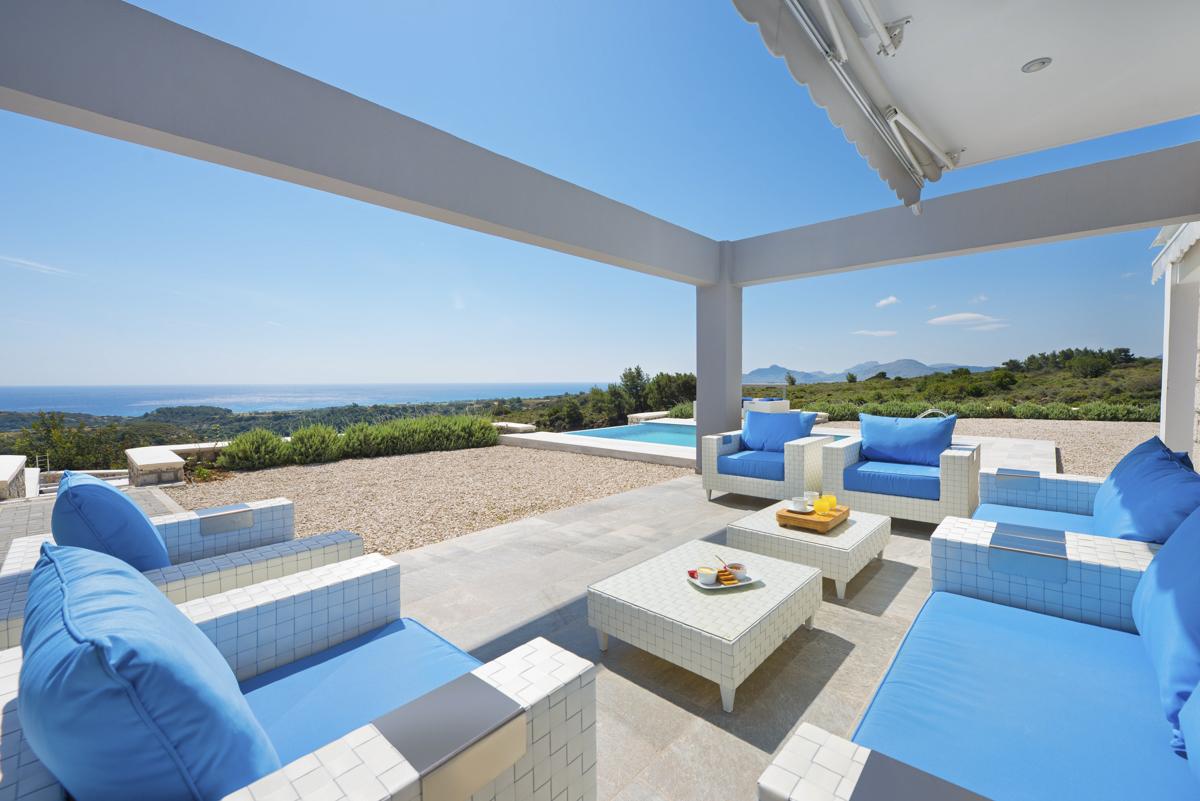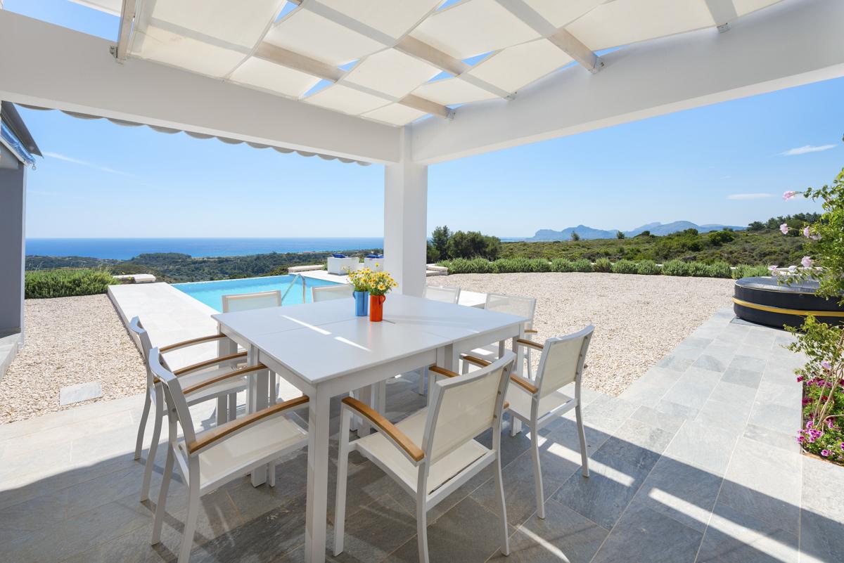 You may take a stroll from the living area out onto the terrace to enjoy the sunshine and the breathtaking views. A barbecue for grilling up fresh fish and preparing meals as a family is located next to a dining table beneath the shade of a pergola. The house has space for everyone to unwind in the sun, making it the perfect Grecian escape. It has a large amount of outdoor chairs, sun loungers, and a sparkling private swimming pool.