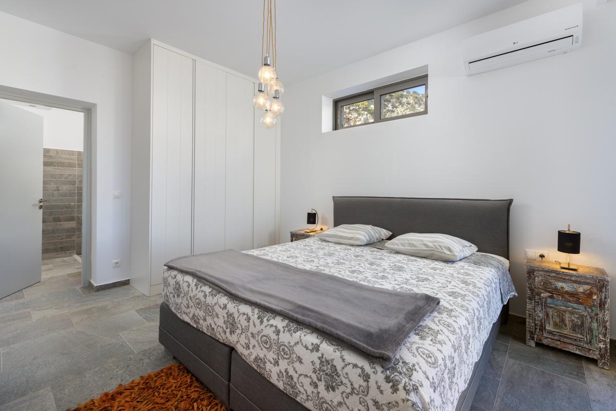 With all modern appliances and lots of space for guests to cook together, the kitchen embraces a sophisticated aesthetic. Even in this open-concept space, the indoor dining table is placed near to the kitchen, and the warm, low lighting gives the area a cosy atmosphere. When you need a respite from the Grecian sun or cosy evenings spent at home, the flat-screen television and comfortable sofas next to the dining area are ideal.