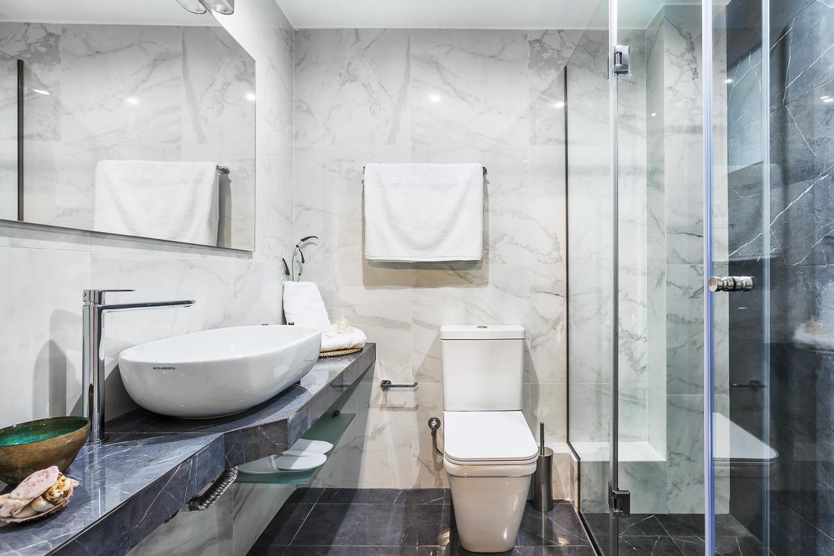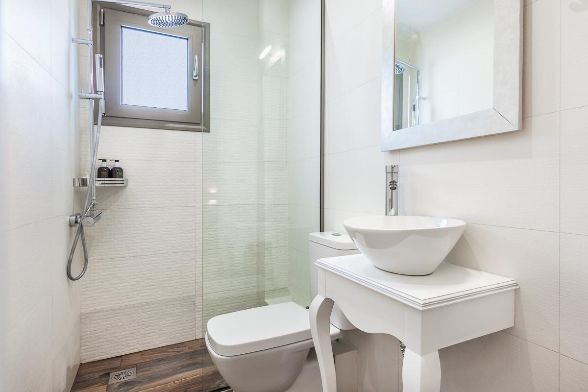 The upper floor, accessed by an elegant marble staircase is where you find the remaining three double bedrooms, one with en-suite facilities and its own balcony. The loft-like bedroom with the unusual mezzanine window is perfect for children, as it is usually set up as a twin room; however, a double bedroom can be arranged to cater to all guests.
