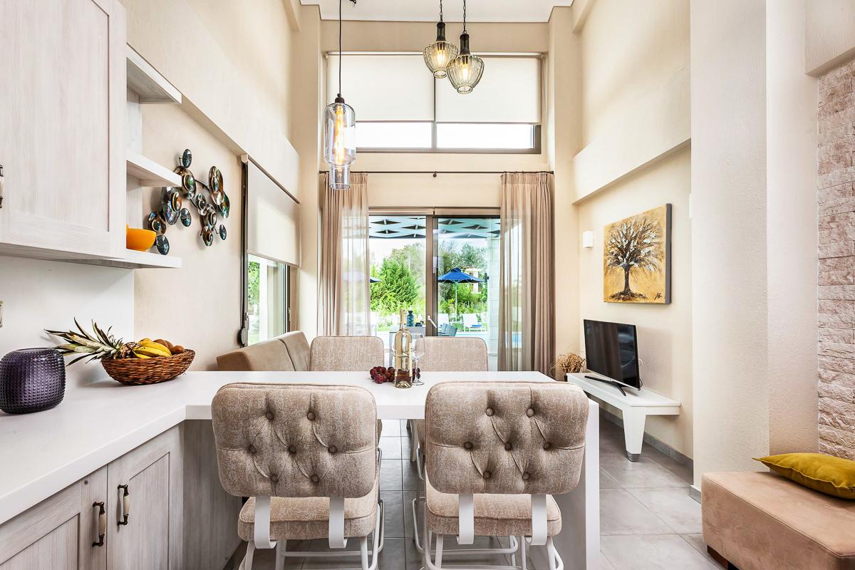 The villa is beautifully appointed, making use of as many sustainable elements as possible; the stunning wood in the bathrooms, bedroom furniture and the extensive decking around the pool and terrace; brickwork walls within the downstairs open space; fabulous tiling in the bathrooms and floors and the external stonework. The furnishings are all exquisite and of the highest quality, all in gentle neutral tones adding to the contemporary but extremely elegant style of the villa.