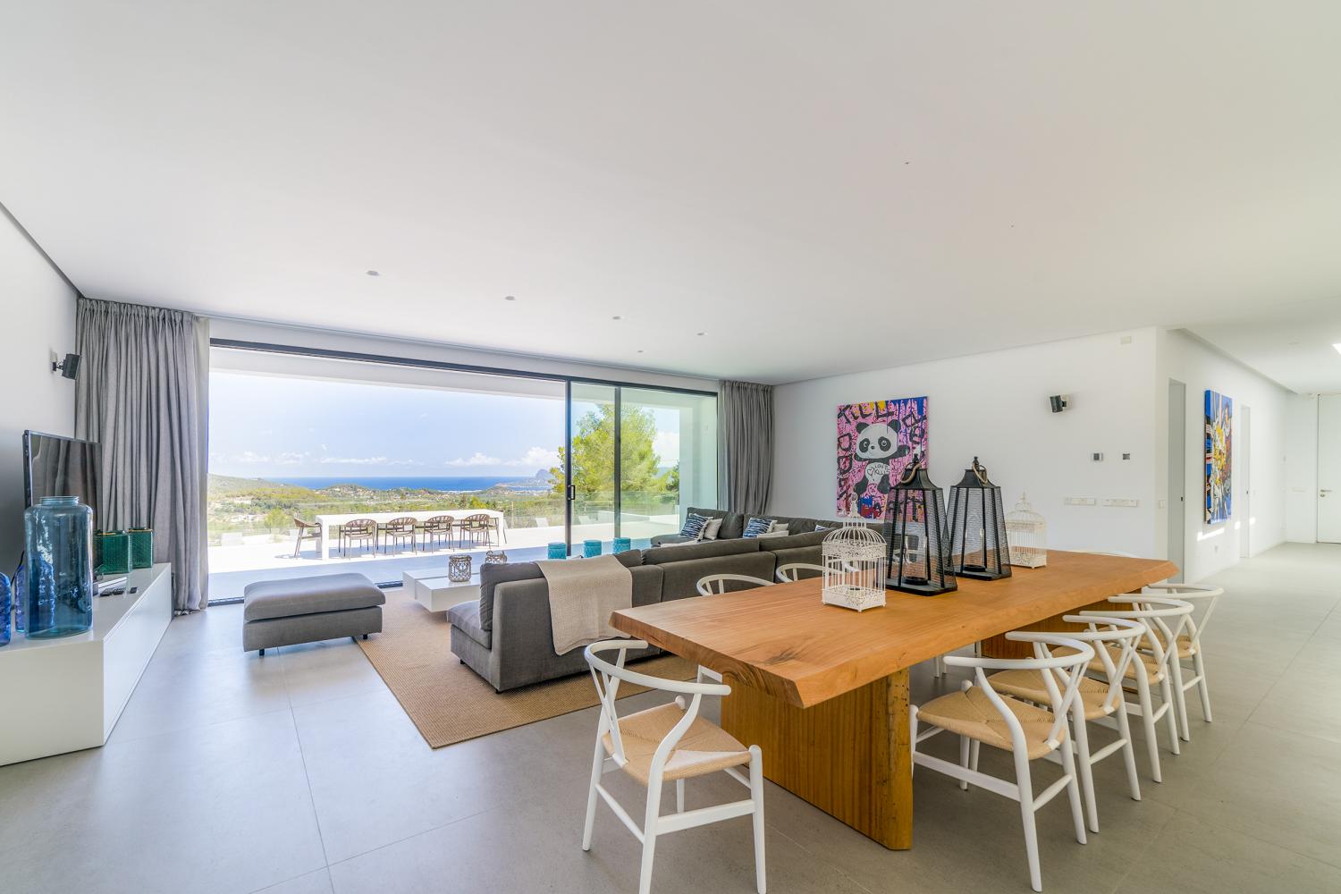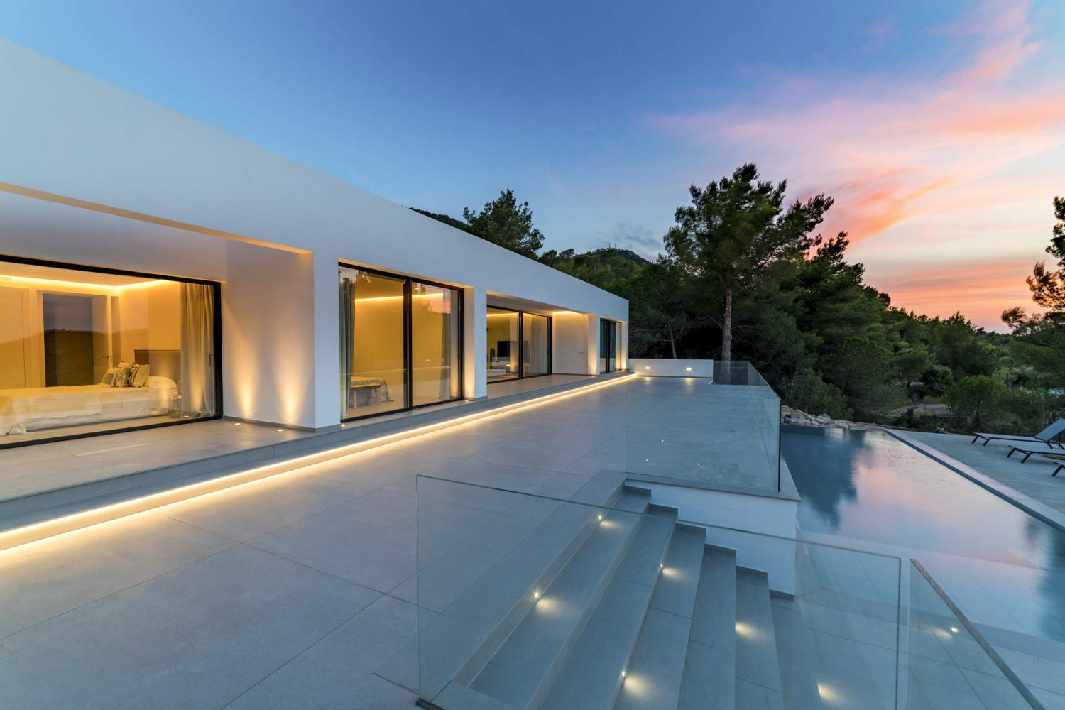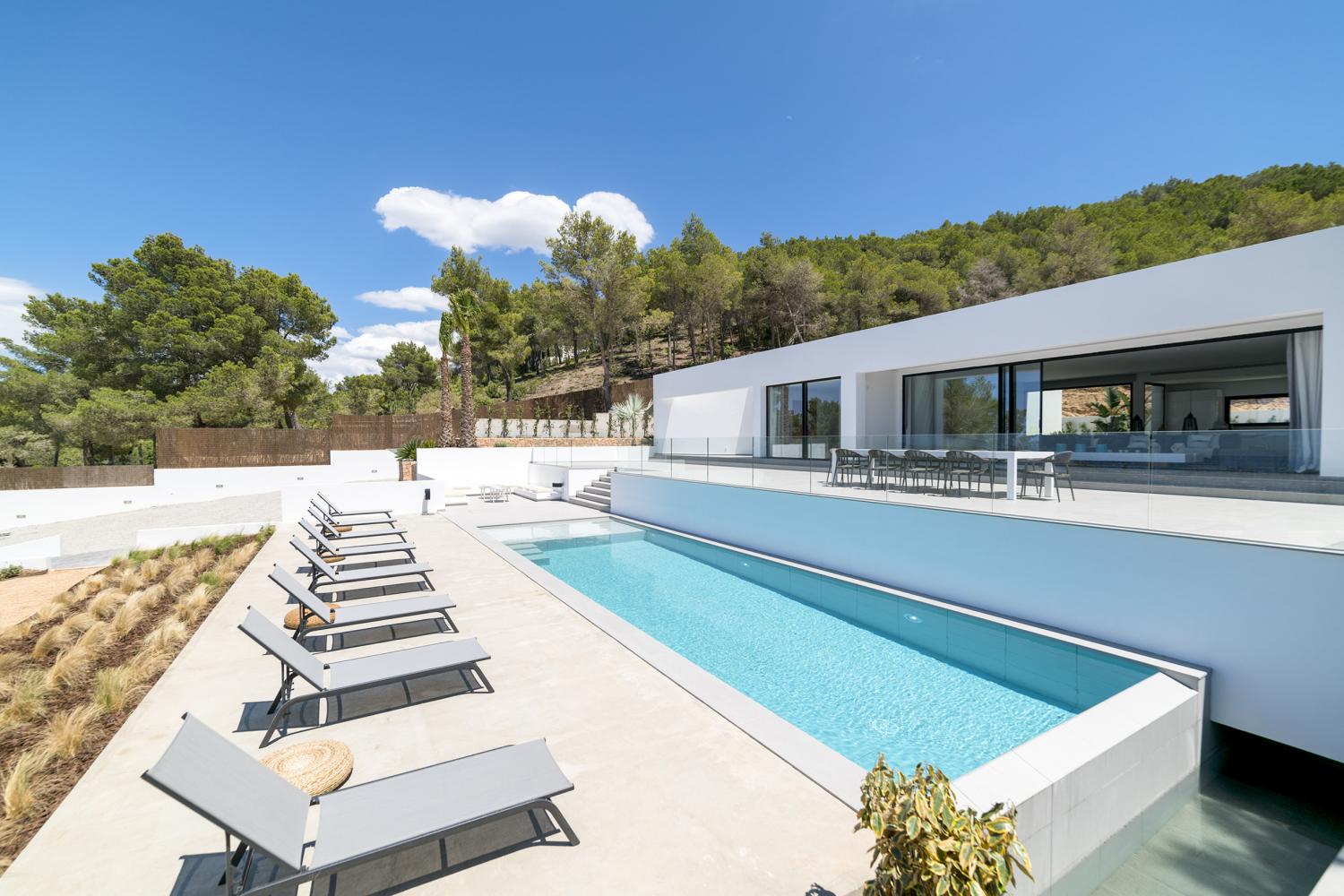 The terraced garden expands around the villa, with both a large dining area and a set of huge sofas on the first storey, a beautiful pool on the second and an array of plants and trees further down the hill towards the main car entrance. There is ample parking on site exclusively for your use. The infinity pool is accompanied by a row of eight sun loungers in which you can enjoy both the sizzling afternoon heat and the world famous Ibiza sunsets amid the mountains in the distance.