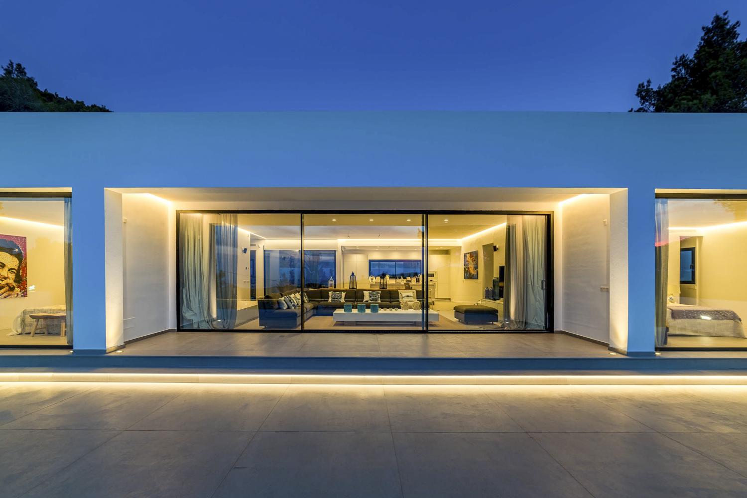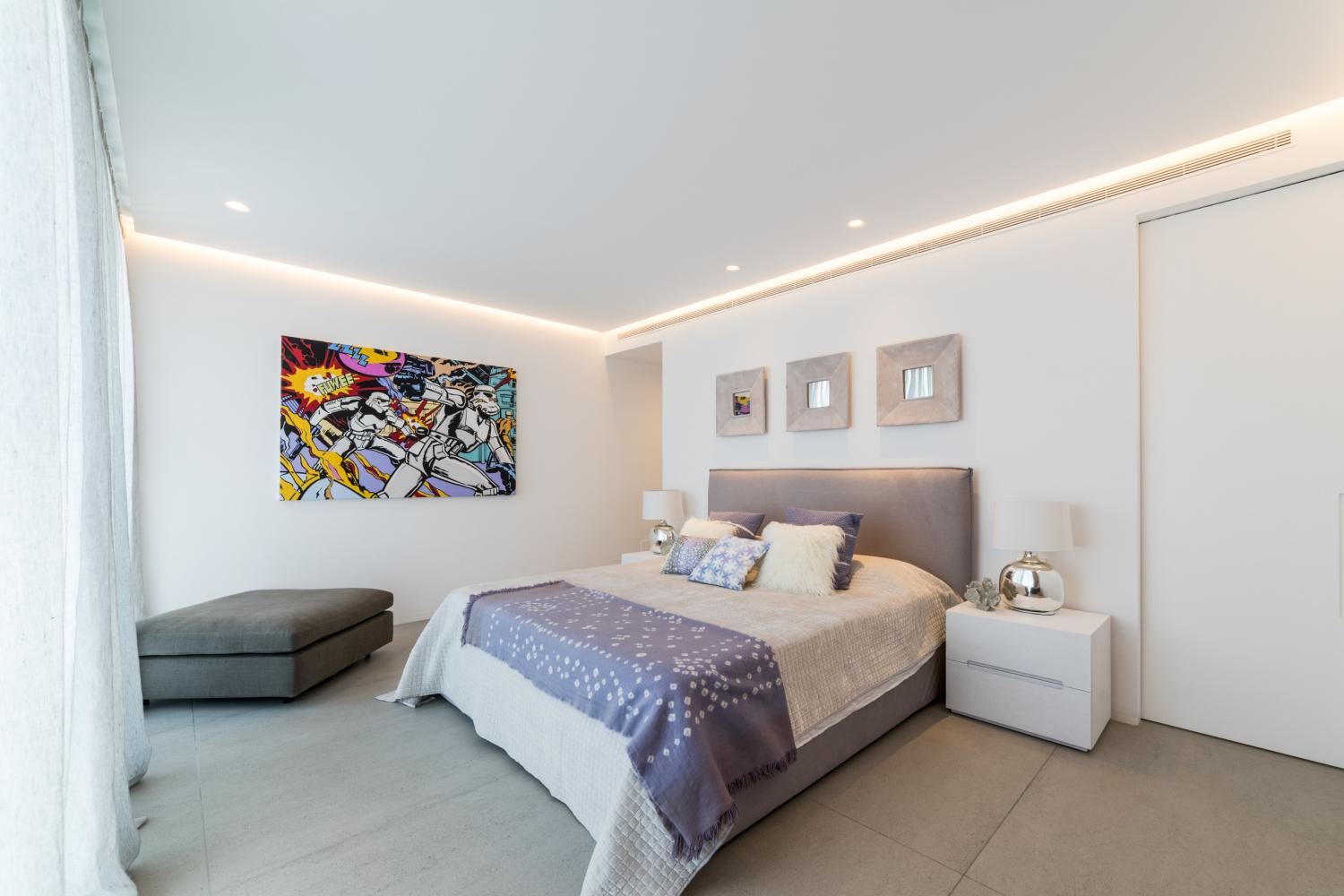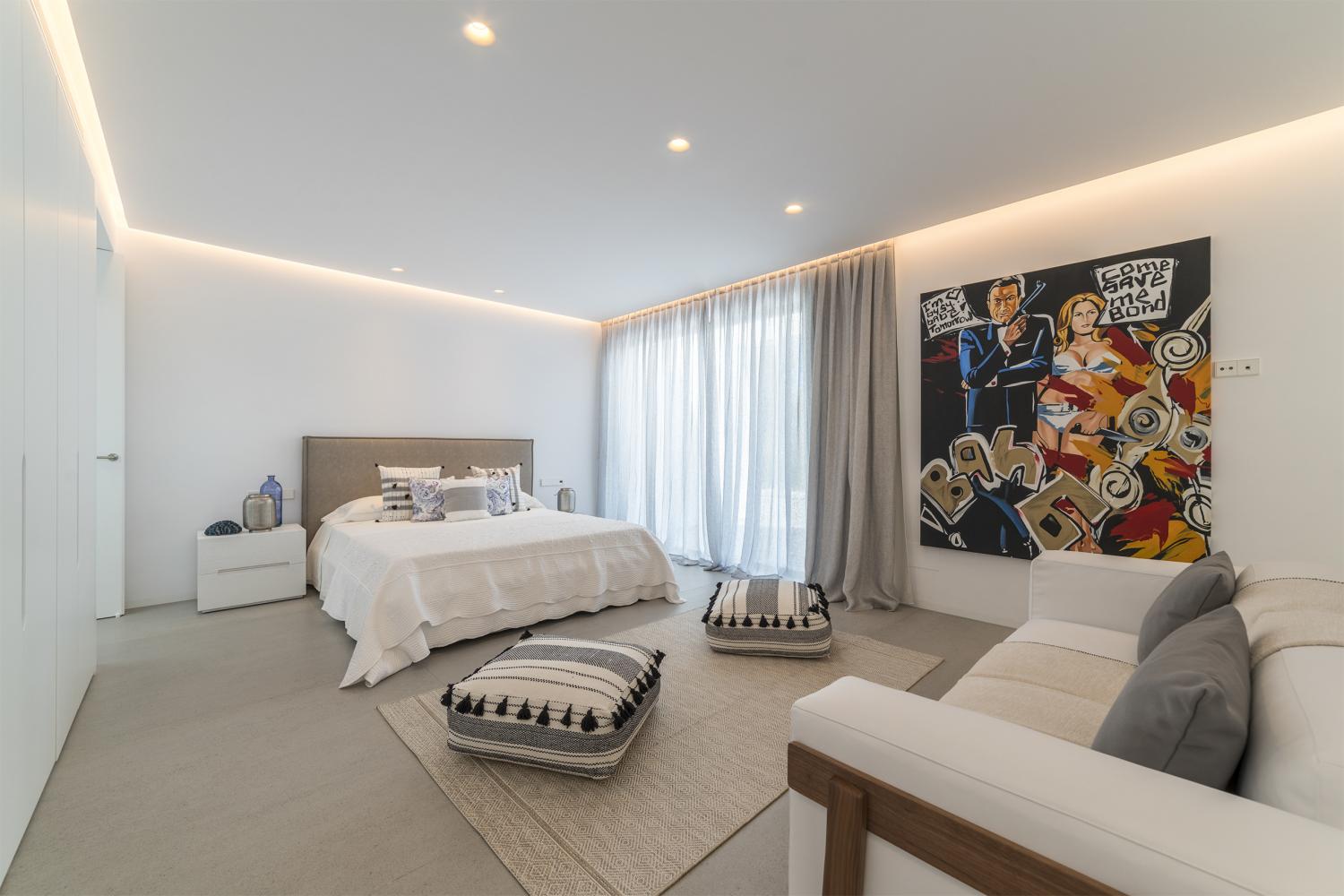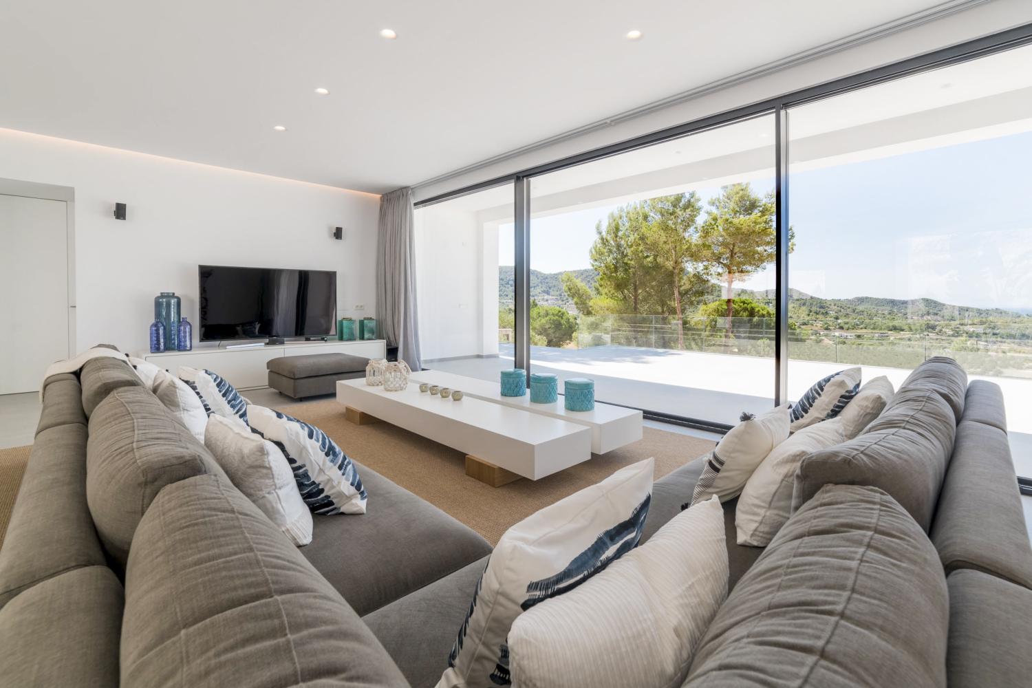 The terraced garden expands around the villa, with both a large dining area and a set of huge sofas on the first storey, a beautiful pool on the second and an array of plants and trees further down the hill towards the main car entrance. There is ample parking on site exclusively for your use. The infinity pool is accompanied by a row of eight sun loungers in which you can enjoy both the sizzling afternoon heat and the world famous Ibiza sunsets amid the mountains in the distance.