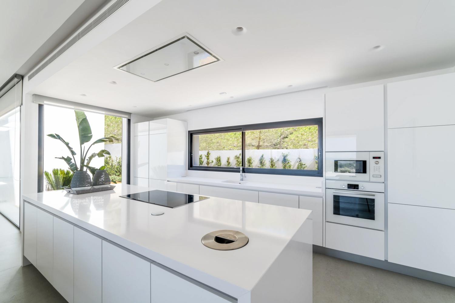 Entrance to the villa brings you into the immensely spacious and bright open living area, with a fantastic L-shaped sofa looking out over the sea and a TV with satellite channels. There’s also both an indoor and outdoor dining table, both seating 10, for you to choose from, whether you’d rather dine in the spacious, stunning interior or venture onto the warm terrace and enjoy lunch alfresco is entirely up to you! The stunning kitchen is almost futuristic with dazzling white fittings and a huge island at which to prepare a meal, and fully-equipped with all the latest mod cons including a coffee machine and juicer.