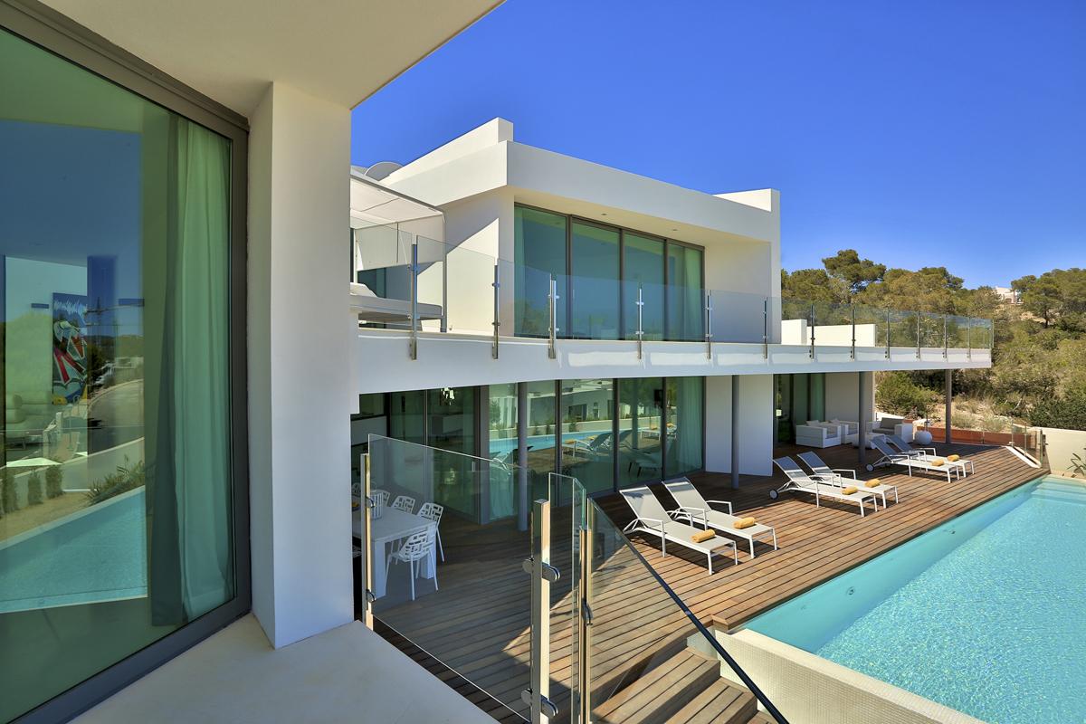 Cosmic Villas is proud to provide this, on Ibiza's famed south coast, the elegant and stunning villa is a very roomy modern masterpiece with views of the sparkling blue bay of Es Torrent.