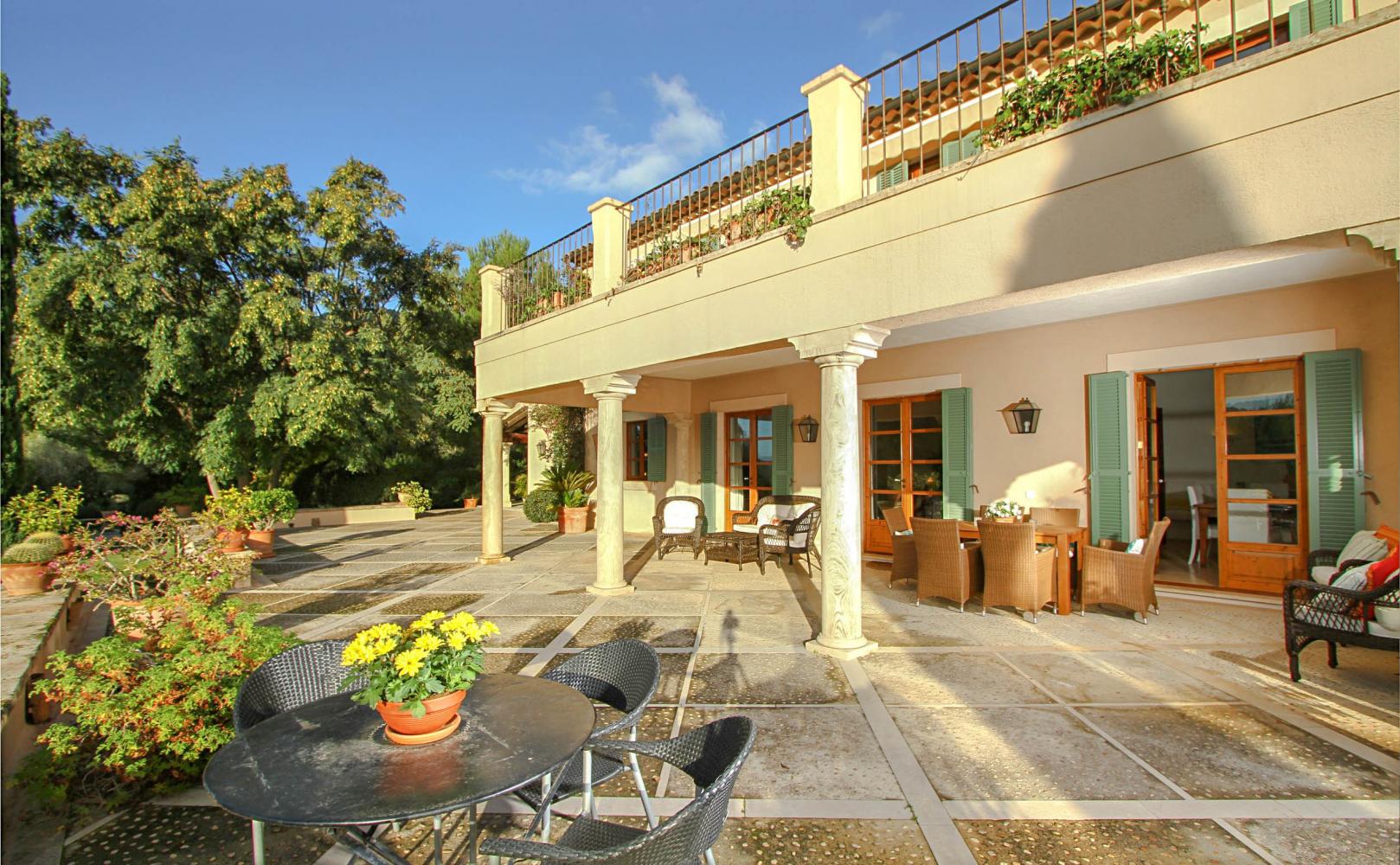 As well as having first-floor terraces from which to soak up the spectacular views over the surrounding area, the central ground-floor patio also offers plenty. It’s partially-covered, providing much-needed shade on hot afternoons. A relaxed seating area is a perfect place to enjoy a pre-dinner drink before moving over to the outdoor dining table for an al fresco dinner cooked on the barbecue.