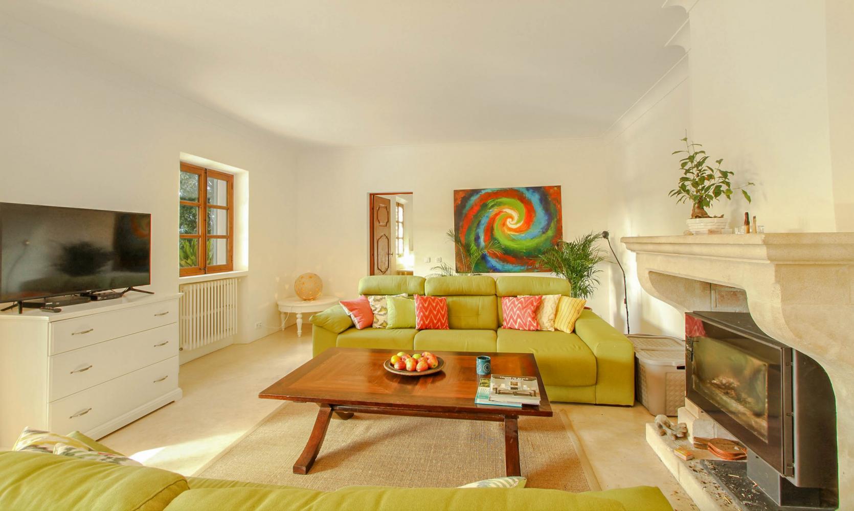 On the ground floor is a large living room with several comfortable sofas and a feature fireplace with a wood-burning stove that’s ideal for those chilly evenings. There’s also a television for snuggling up and enjoying movie nights, with doors opening onto the terrace to help bring the outside in during the day.