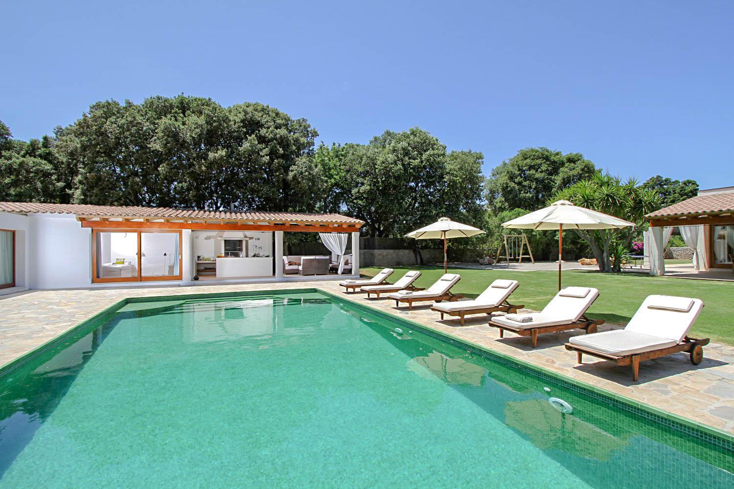 Outside in the garden, the private swimming pool, which is illuminated at night, takes centre stage and is aligned with sun loungers and parasols either side on the sun terrace.