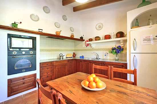 Inside, this holiday villa retains its classic country style, with wooden beams overhead and rough stone walls in the living room. Floral tiling in the eat-in kitchen and bathrooms makes a pretty picture, while upgrades like the Jacuzzi tub keep you in comfort. The master bedroom has an en suite bathroom, while the three remaining twin rooms share the two other bathrooms.