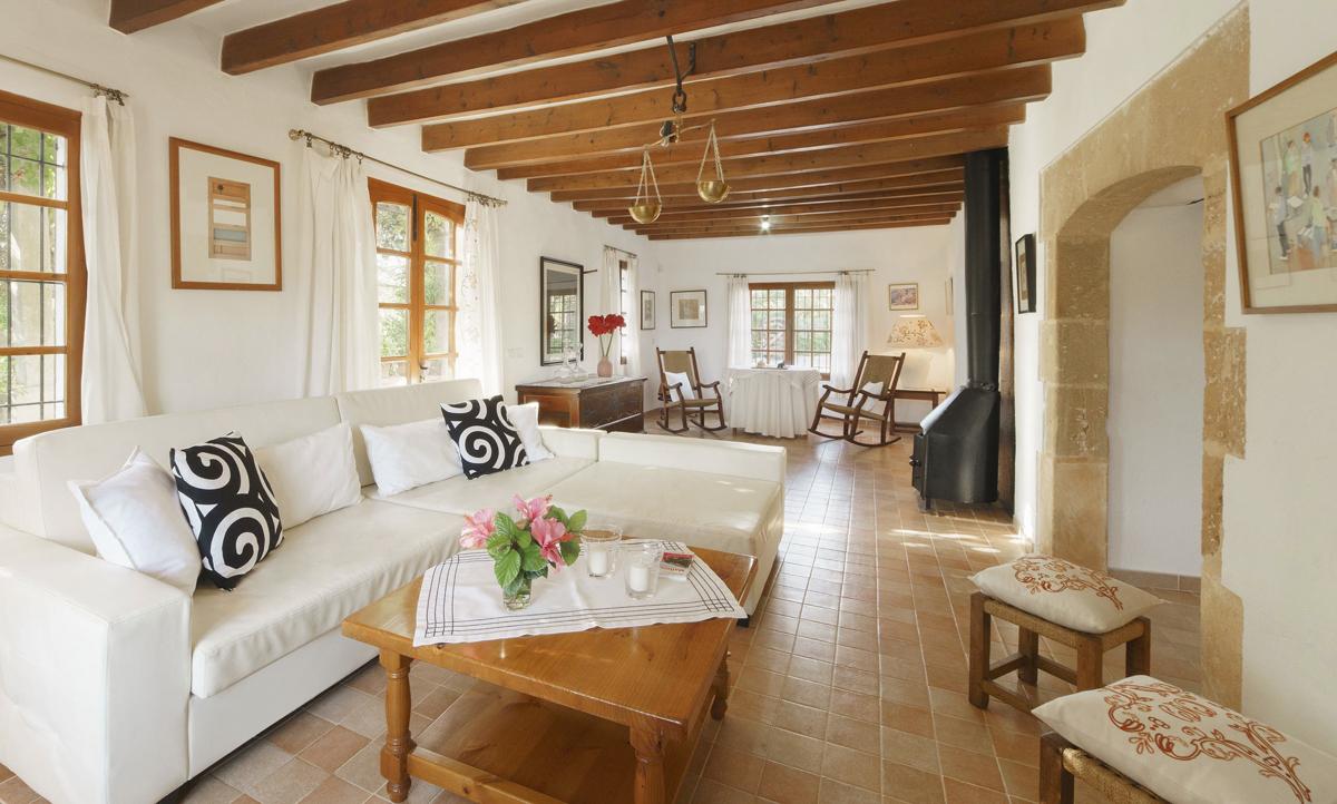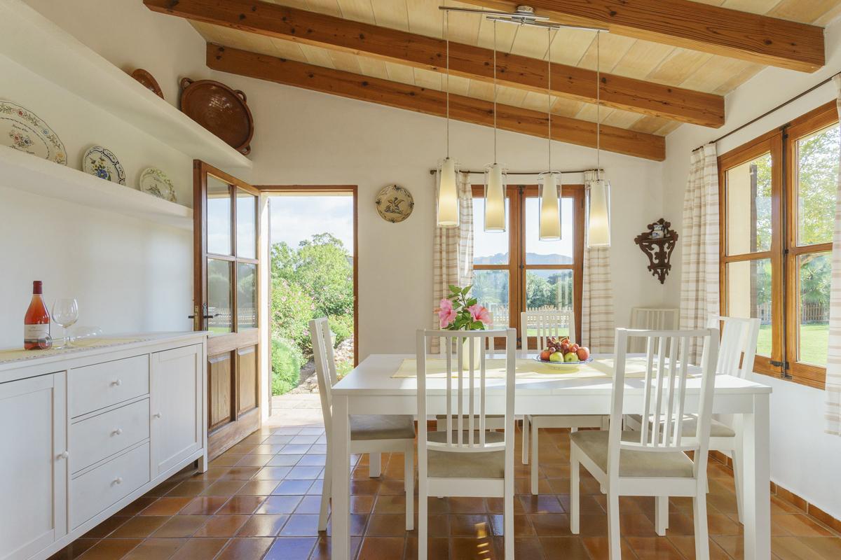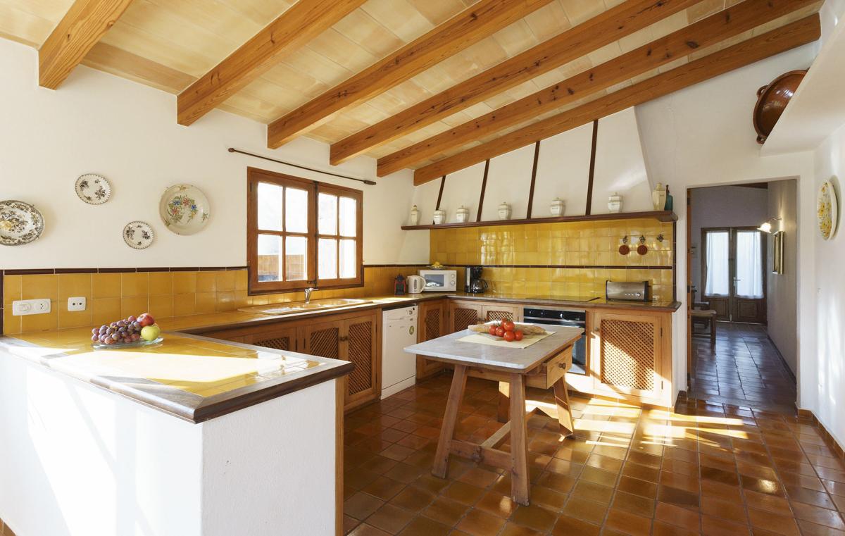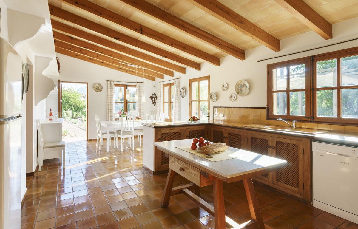 The open plan living space is incredibly bright and the white dining table adds to the calm and fresh ambience. Adorned with rustic decorations, from plates to wooden clocks to old lamps, the villa will satisfy your need for a traditional country-house feel without sacrificing either quality or comfort. The vast kitchen is utterly charming, with a huge space for preparing a delightful meal or two, and traditional tan-yellow tiles complementing the wooden units and ceiling. Wooden beams extend throughout the entire villa, upholding the typical Mallorcan style and grounding you in the history of the area.