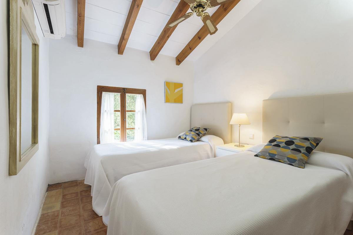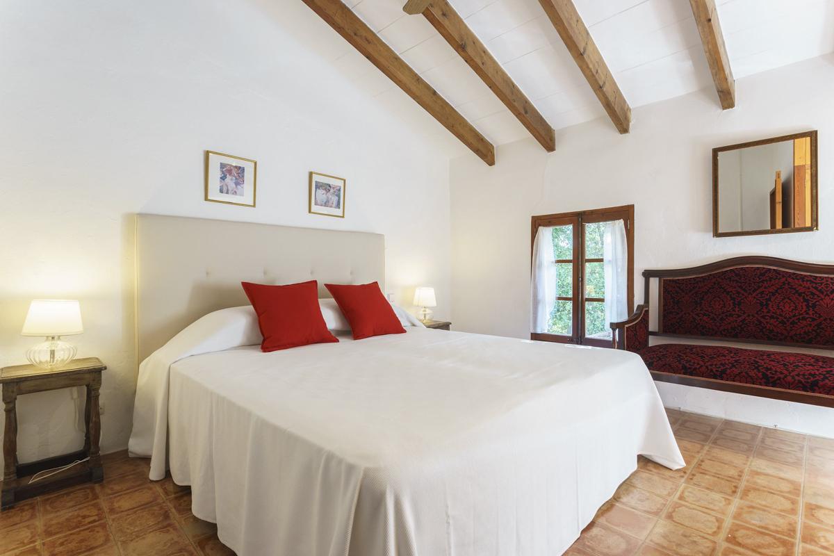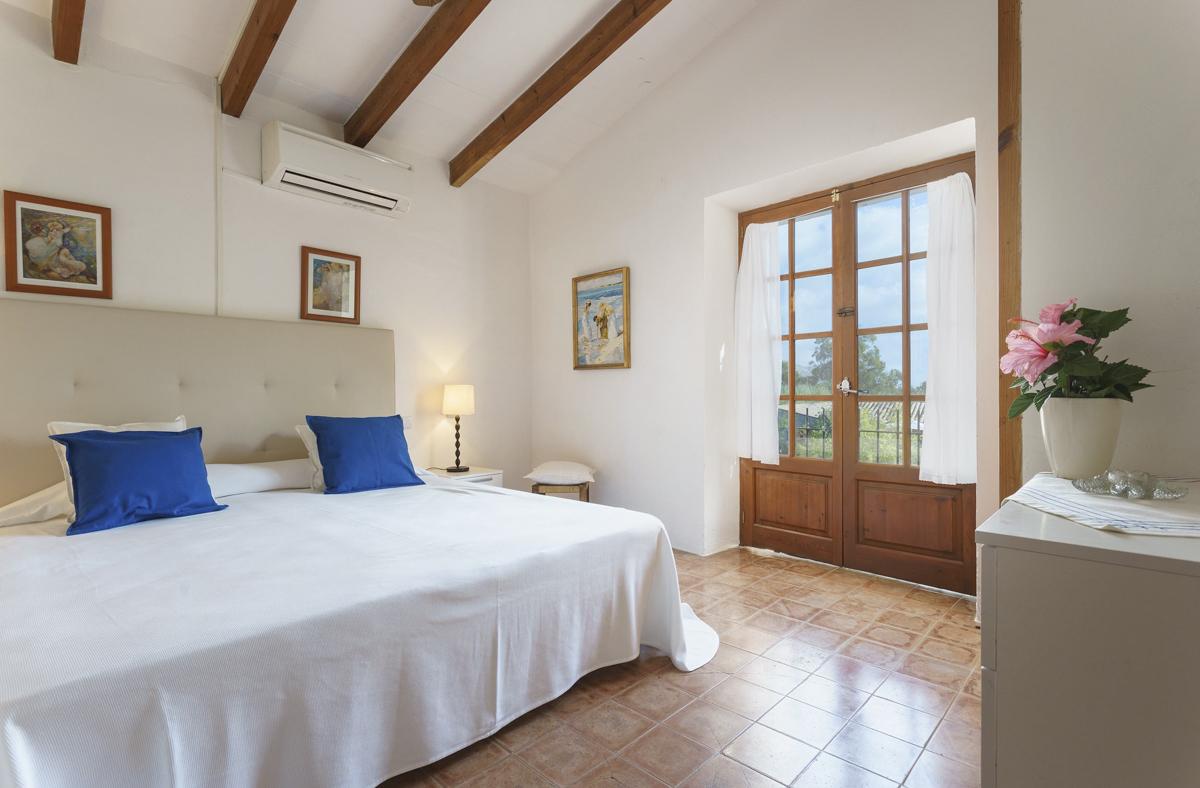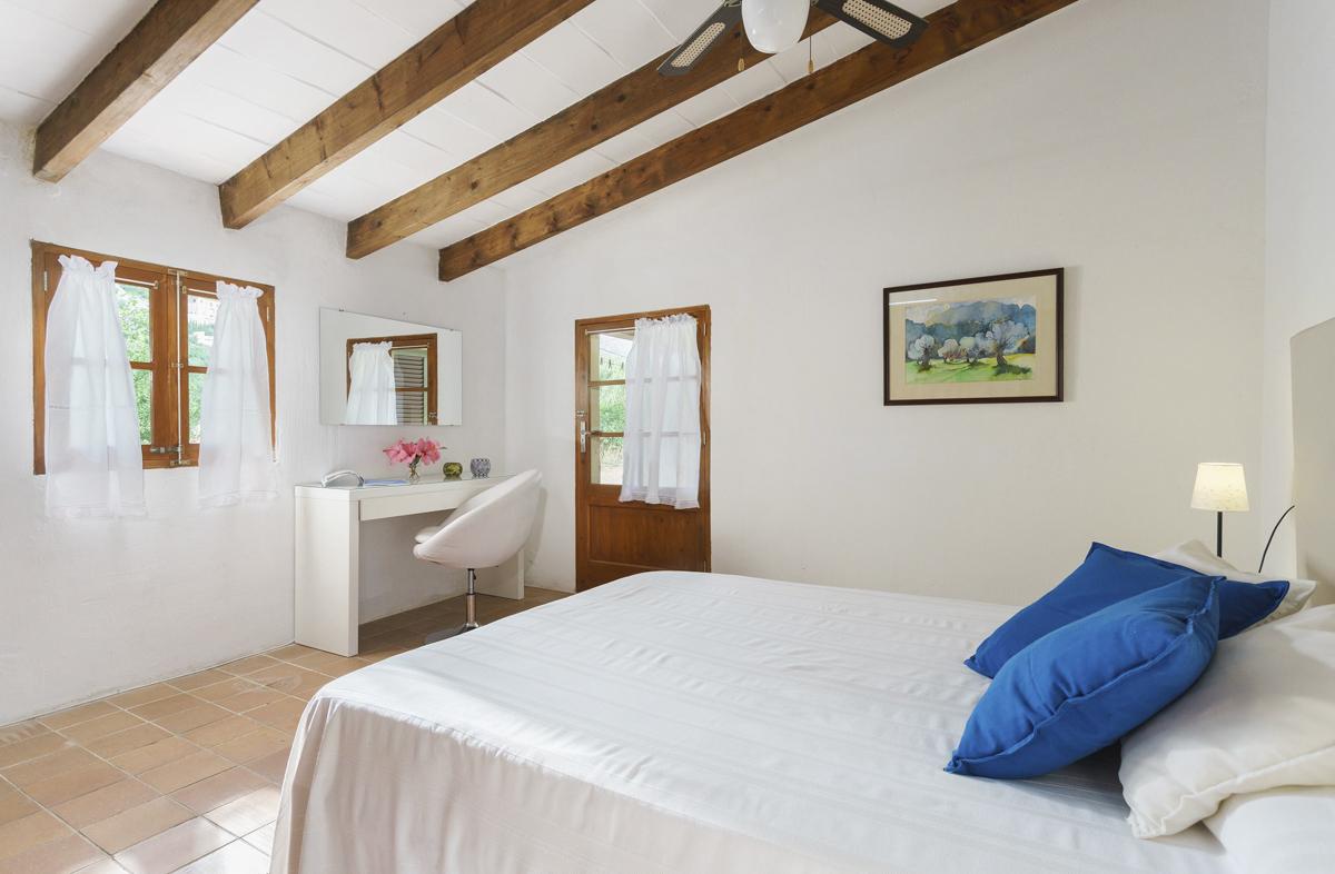 The open plan living space is incredibly bright and the white dining table adds to the calm and fresh ambience. Adorned with rustic decorations, from plates to wooden clocks to old lamps, the villa will satisfy your need for a traditional country-house feel without sacrificing either quality or comfort. The vast kitchen is utterly charming, with a huge space for preparing a delightful meal or two, and traditional tan-yellow tiles complementing the wooden units and ceiling. Wooden beams extend throughout the entire villa, upholding the typical Mallorcan style and grounding you in the history of the area.