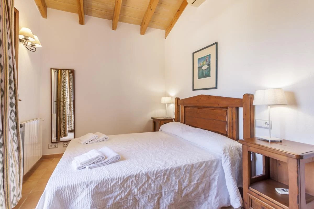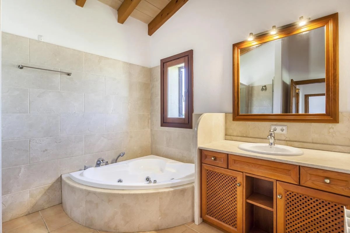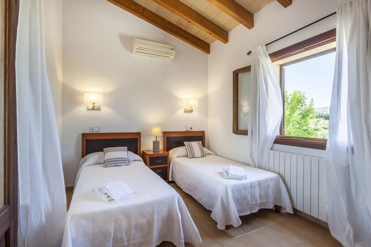 As you step up to the first floor, the views from each room and the beautiful terraces are far-reaching, looking out over the surrounding, unspoilt nature towards the scenic mountains in the distance. This floor boasts two lovely bedrooms. The double bedroom has its bathroom with a luxurious jacuzzi, and the adjacent twin room makes use of a separate shower room.