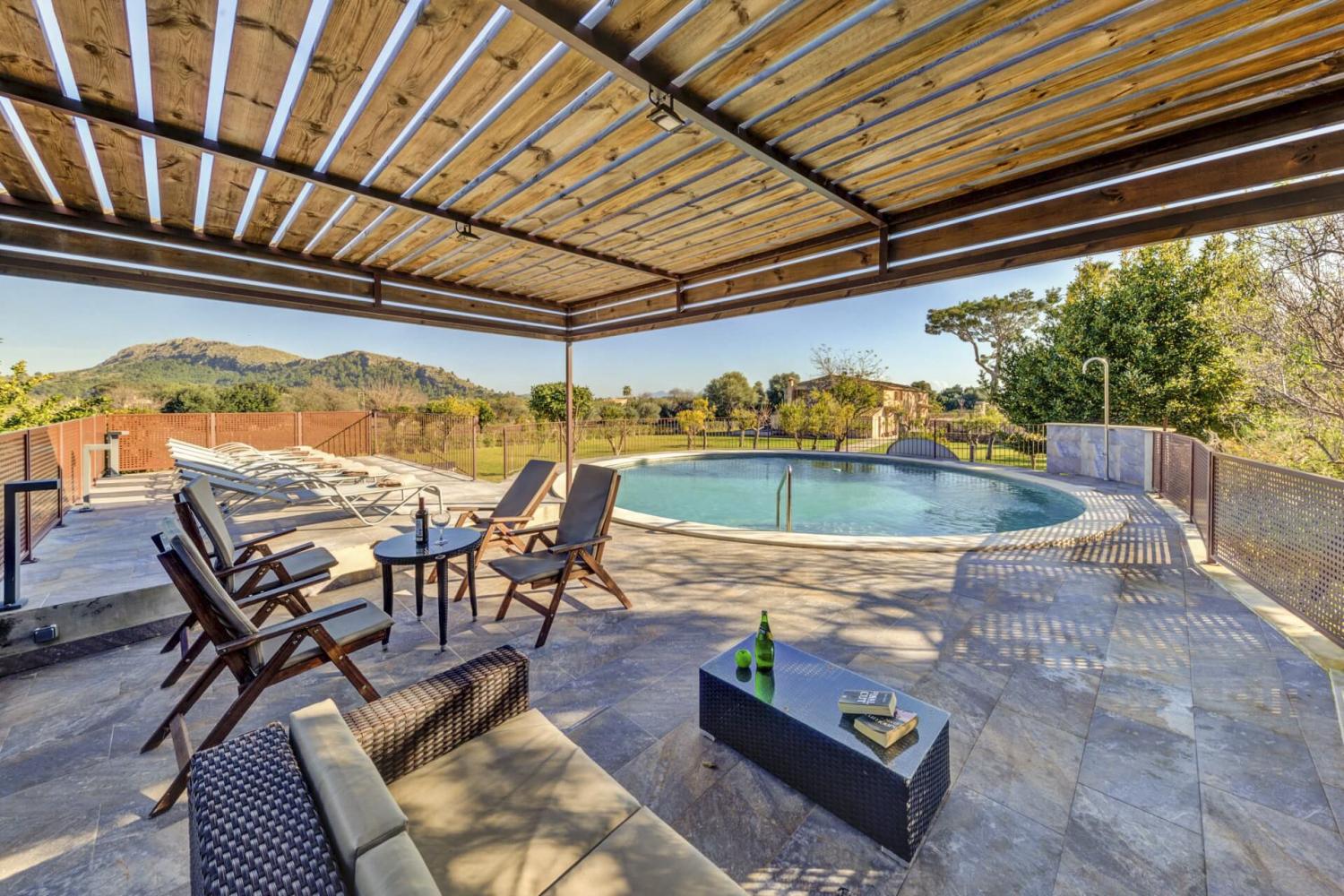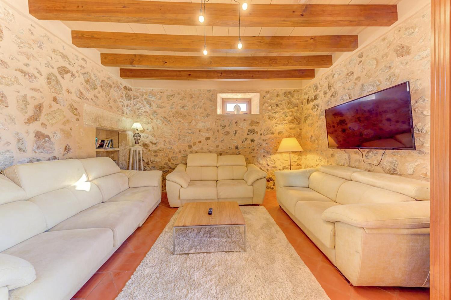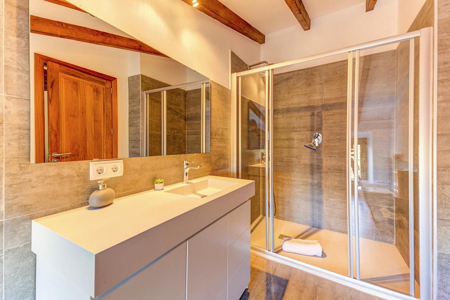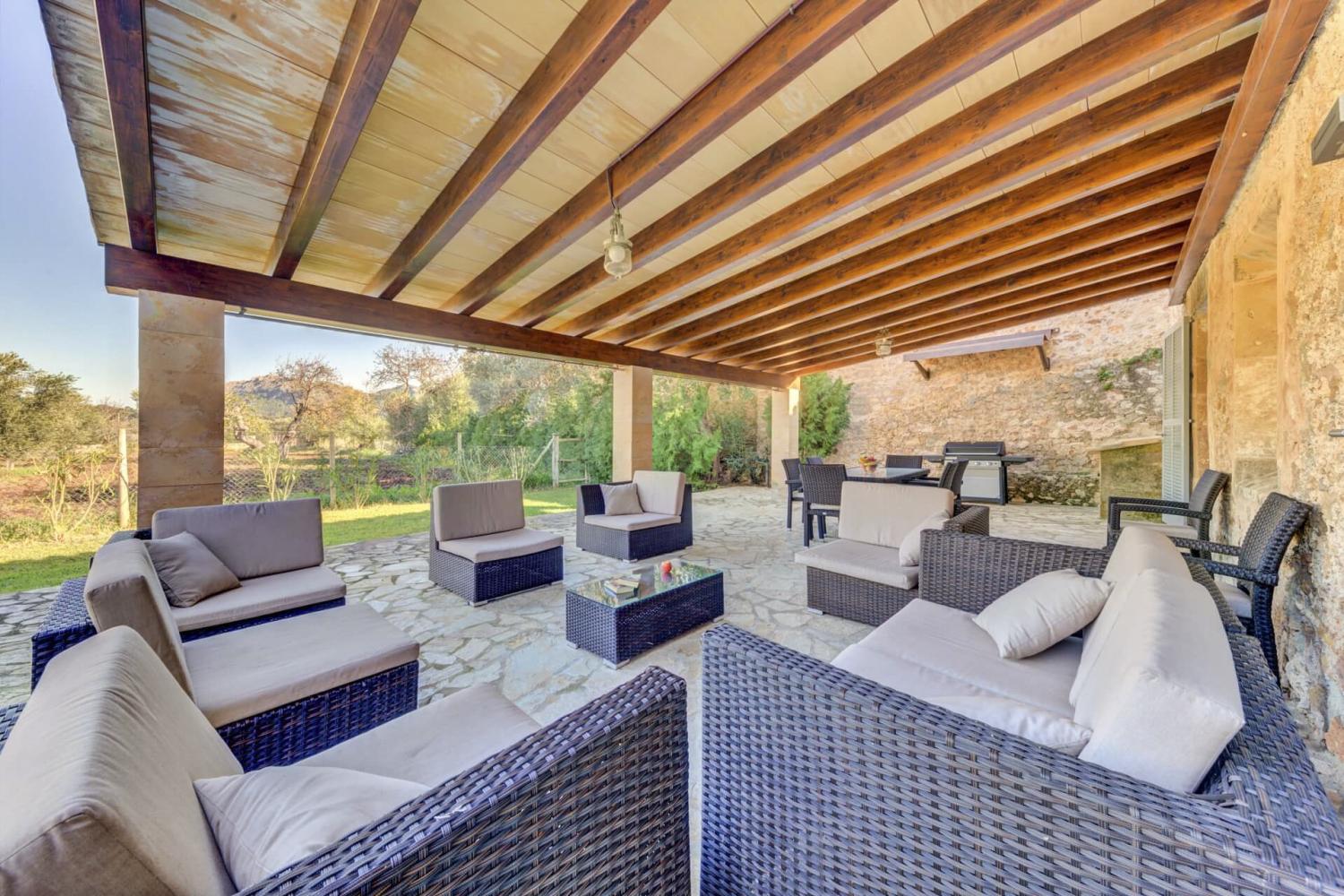 Spend unforgettable days whilst on the exterior of the villa. Surrounded by the breathtaking natural beauty of rolling fields and the peaks of the Tramuntana mountains, relax on the outdoor terrace decorated with a dining table, artsy chairs and rattan sofas, under the shade of a wooden roof. Take walks around the extensive outdoor area, where you can play games on fields or games scattered around the villa. When you want to cool off from the sizzling sun, why not slink into the outdoor swimming pool and for cooling relief. If you want to feel the sun's force, you can bask in its rays on sun-loungers or recline on more sofas and seats here!