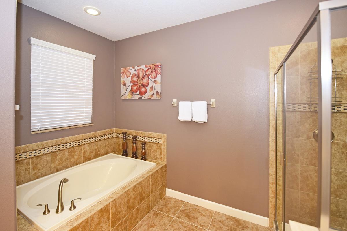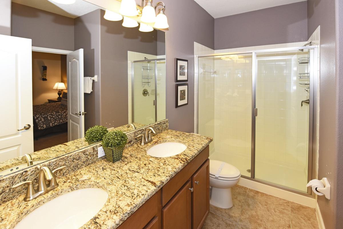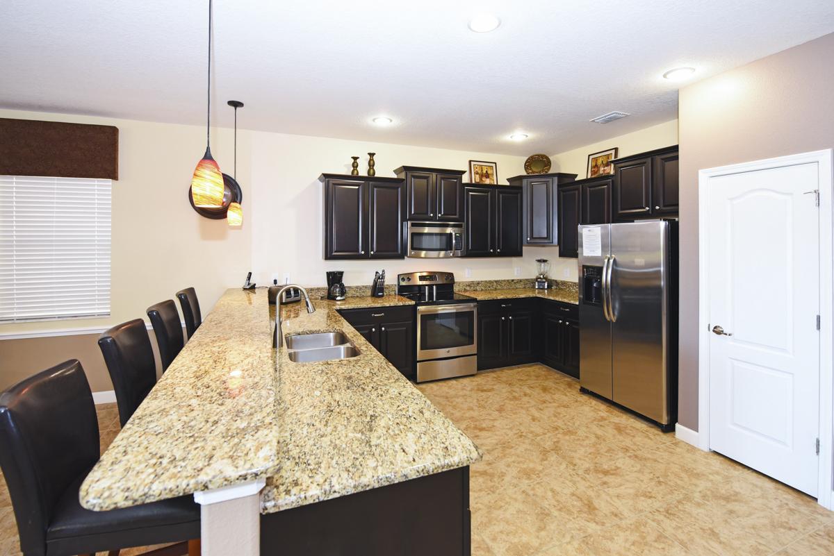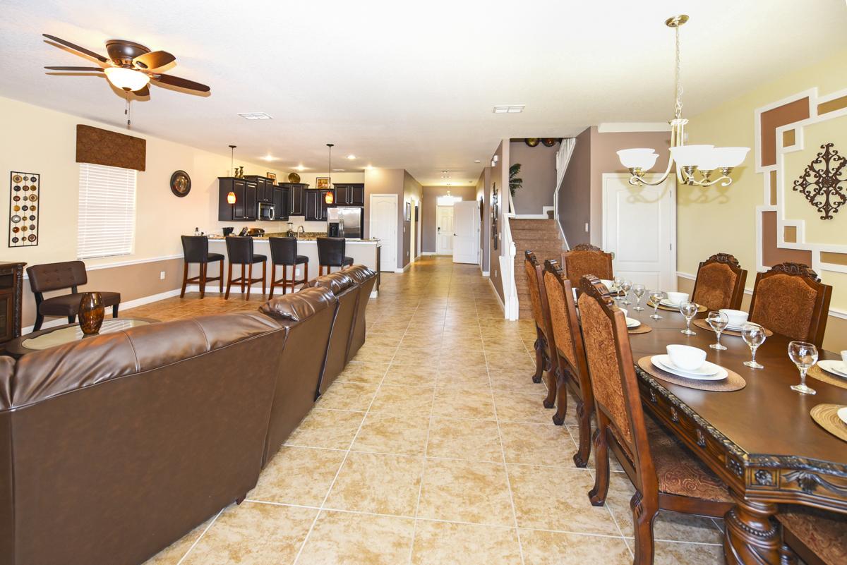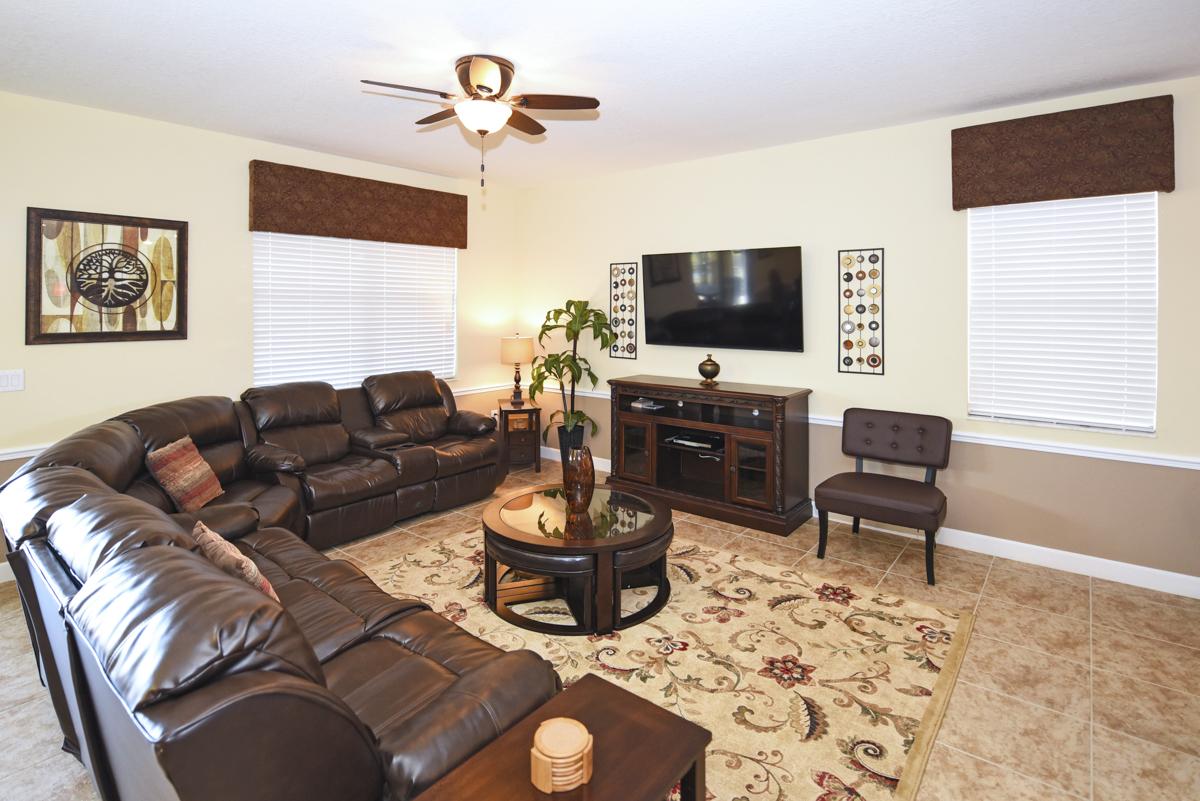 The living room is delightfully spacious, with a large leather sofa in front of the 60” TV where all the group can gather for a little relaxation after a long day enjoying the sights of Florida!